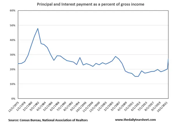 At the end of 2021, the median household income in the US was about $70,000 and the median home price according to the National Association of Realtors was $346,900. The 30-year fixed rate mortgage was 2.96%. The principal and interest for a year would be roughly $14,000, which is about 20% of income. Fast-forward 3 months, with a median home price of $363,100 and mortgage rates of 5%, that principal and interest payment is now roughly $18,900, which is a 35% increase from the beginning of the year. Incomes are increasing at about 1.5% per quarter, so if we look at the new percentage, it works out to be 26.6%, which is a massive increase in a short 3 months.