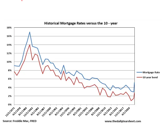 Below is a chart of the 10-year bond yield and the 30-year mortgage rate going back to 1975. Interest rate cycles are long and gradual, and by historical standards still quite low.
