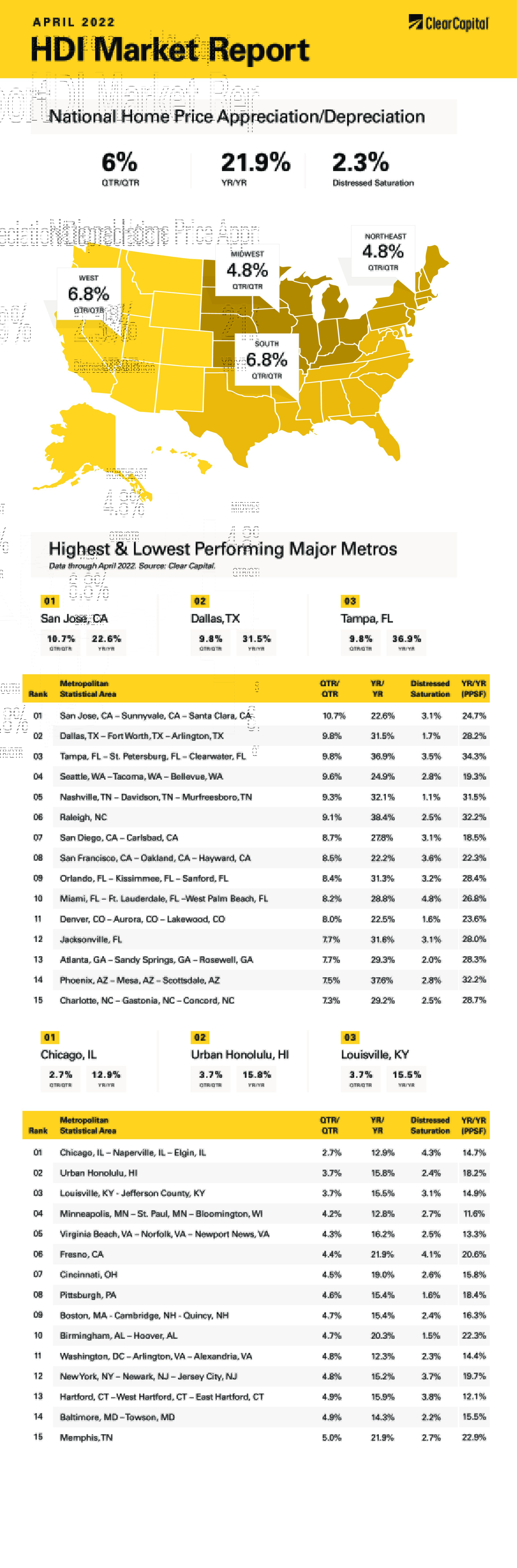 The April 2022 Home Data Index™ (HDI™) Market Report shows national quarter-over-quarter (QoQ) home price growth is at 6 percent.