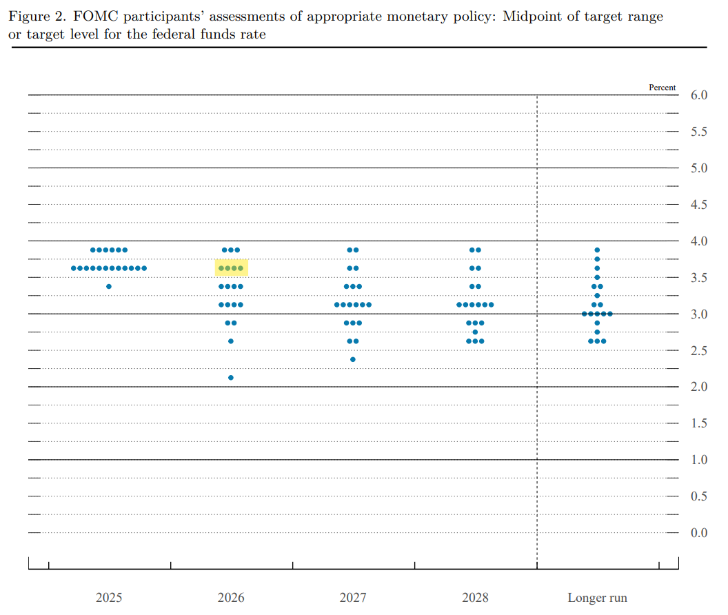 The job market is stable with limited hiring and limited firing. Absent a recession we probably won’t see mass layoffs, and I think most people have spent enough time with ChatGPT to realize it isn’t going to be replacing jobs en masse any time soon. Falling immigration and continued deportation will depress growth in the labor force. The Fed sees the unemployment rate falling slightly in 2026, from 4.6% to 4.5%. They also bumped up their GDP forecast from 1.8% to 2.3%. Bottom line, absent something like a stock market crash or a black swan event, rates will move marginally lower in 2026 but that is it. By the June 2026 meeting, declining shelter inflation will drag the indices close enough to the 2% target that the Fed can cut one more time, declare victory over inflation, and call it a day.