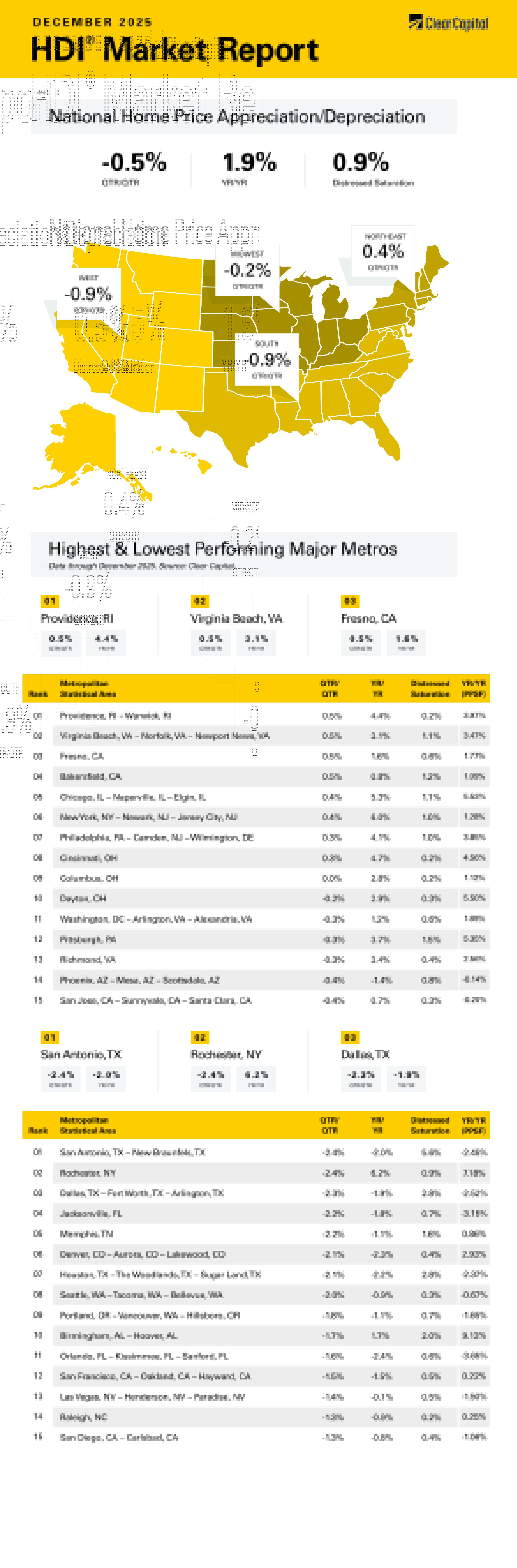 The December 2025 Clear Capital Home Data Index (HDI®) Market Report shows national quarter-over-quarter home price growth is at -0.5 percent.