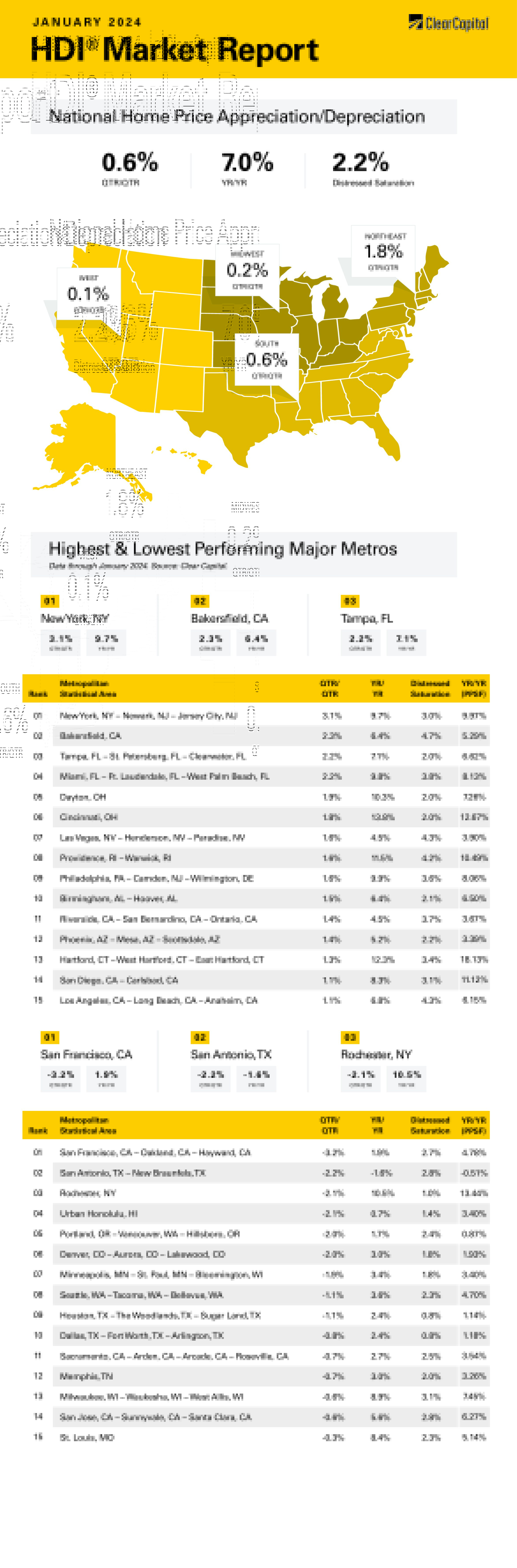The January 2024 Home Data Index (HDI®) Market Report shows national quarter-over-quarter (QoQ) home price growth is at 0.6 percent.
