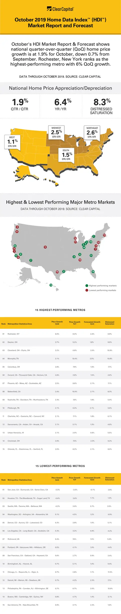 The October 2019 Home Data Index™ (HDI™) Market Report and Forecast shows national quarter-over-quarter (QoQ) home price growth is at 1.9 percent for October, down 0.7 percent from September.