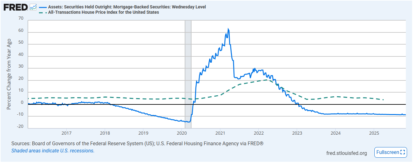 It certainly appears that the two numbers correlate. You can see the effect of quantitative easing during the pandemic translating into higher home price appreciation, and as the Fed reversed policy in 2022, home price appreciation slowed. It also looks like the reduction in MBS holding in 2018 and 2019 dampened home price appreciation.